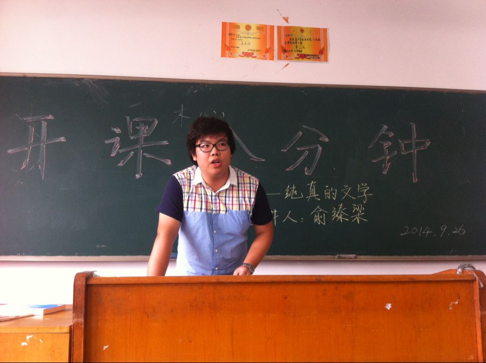 2014年9月26号,第一次“开卷八分钟”开讲啦!第一卷是由护理支部的俞臻梁同学来主讲,他主要是通过《哥伦比亚的倒影》给大家讲述的是作者木心。“如预相见,我在各种悲喜交集处,能做的只是长途跋涉的归真返璞”,文如其人,木心是一位喜欢采用文字的功力去探讨生命中或者世界中一些不解的现象,是一位有哲学思想的,独具风格的诗人、画家、作家。