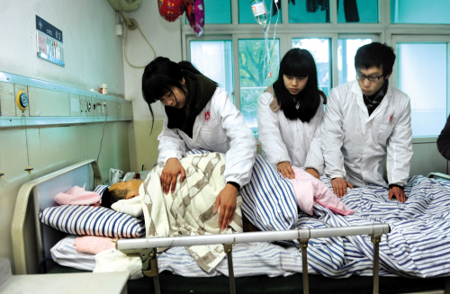 参与护理工作的同学反映:“作为志愿者,我们很乐意提供服务;作为医学生,我们可以发挥专业特长,积极为他人服务,这是我们的荣幸”。为此,每周六周日的上下午安排学生开展服务工作,参与志愿者服务的有大二、大三的临床、护理和药学的300多名学生,我们的志愿者队伍在不断扩大,一批又一批的志愿者加入了护理行列。活动过程中,我们也了解到,政府及社会的其它组织机构都非常关心这位平民英雄,纷纷献出爱心,并期盼着他早点醒过来,同时,现在专门请了一位阿姨帮忙照顾及护理俞文华。