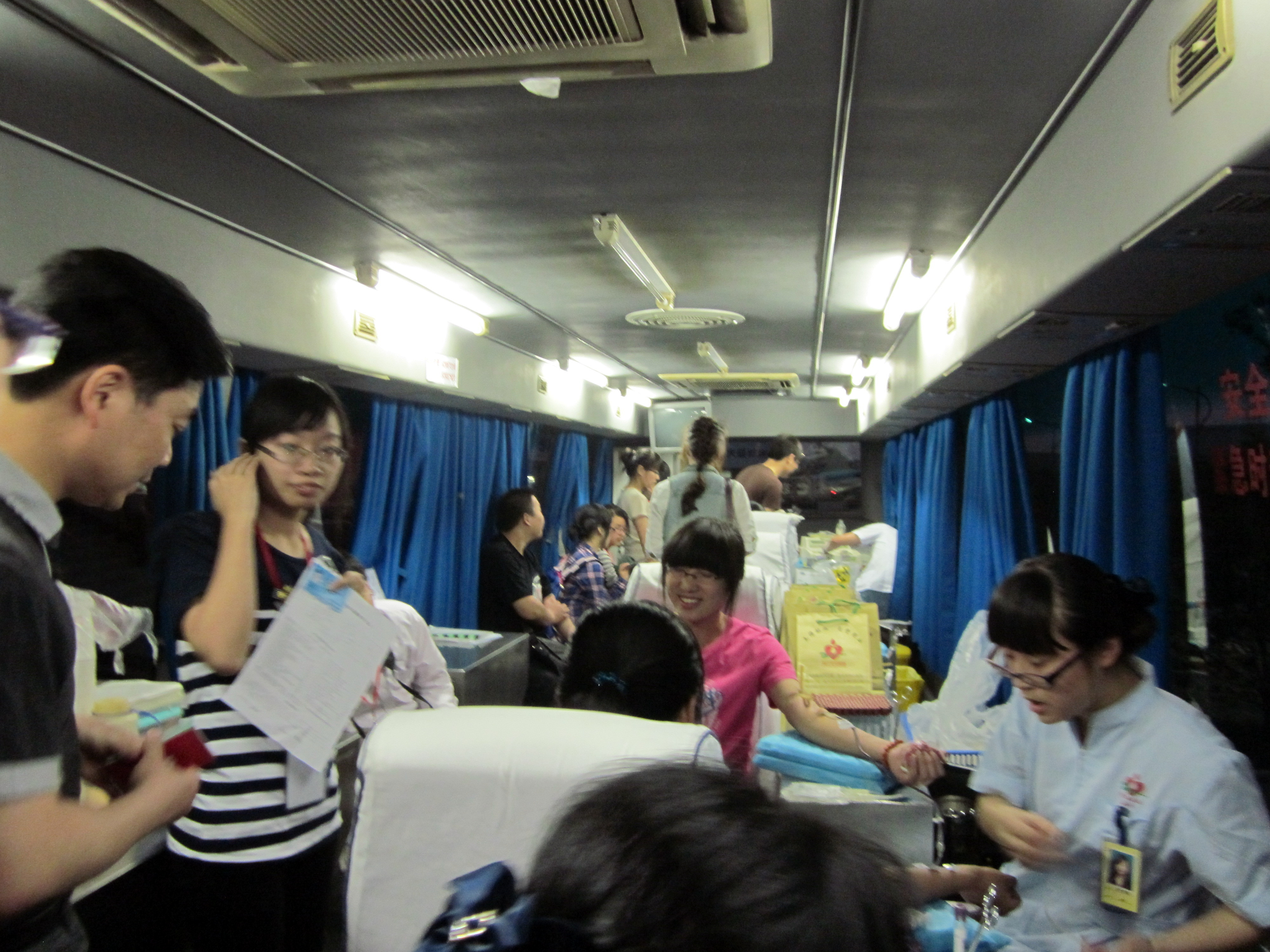 活动现场共有25名同学踊跃献出200ml血液,38名同学经抽取10ml血样无偿捐献造血干细胞,加上前天晚上献血的17名同学,目前共有55名同学志愿加入中华骨髓库。从献血车到捐献造血干细胞现场,处处上演着一幕幕爱心奉献的动人场景。