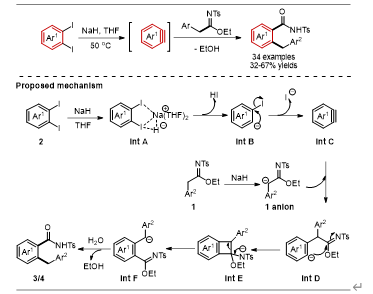图1. NaH介导的芳炔与N-磺酰亚胺酯的C–C键插入反应示意图