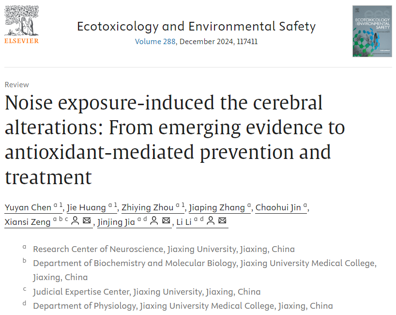日前,ACG港湾 神经生物学团队在JCR Q1中科院二区期刊Ecotoxicology and Environmental Safety发表题为:Noise exposure-induced the cerebral alterations: From emerging evidence to antioxidant-mediated prevention and treatment的综述论文。曾宪思副教授、贾金婧副教授和李丽教授为本论文的共同通讯作者,ACG港湾 临床医学专业本科生陈与彦、黄杰、周芷颖、张佳萍和金超慧参与论文撰写相关工作,陈与彦、黄杰和周芷颖为共同第一作者,嘉兴大学为唯一完成单位。