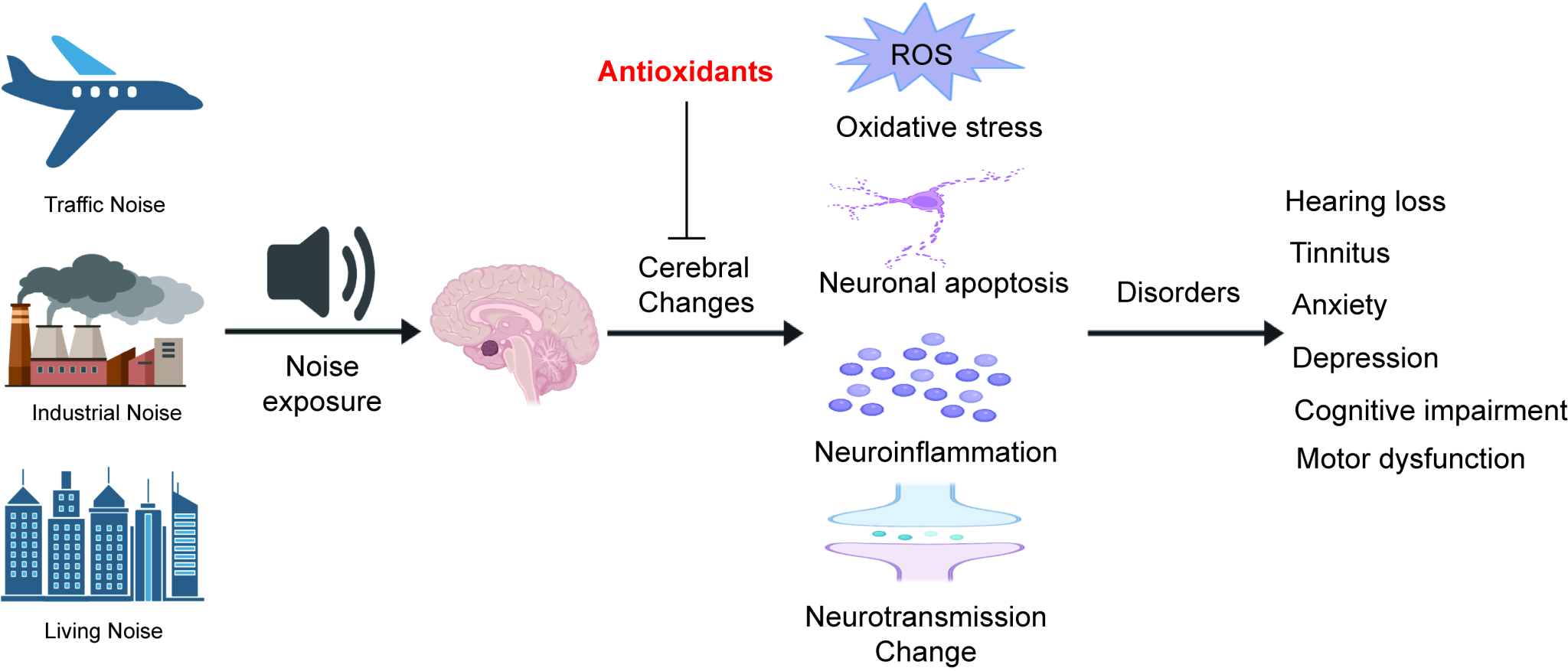 噪音是一种公认的健康风险,也是环境暴露的重要组成部分。随着现代化社会的发展,噪声污染已成为一个不可避免的且日益严重的公共环境问题。噪声暴露对中枢神经系统的影响是神经生物学团队的一个重要研究方向。团队成员曾宪思副教授、贾金婧副教授和李丽教授非常重视学生的科研思维和科研能力的训练,指导本科生聚焦噪声暴露研究前沿、收集文献并进行分类总结,综述了长期噪声暴露对脑组织的影响。噪声暴露可以诱导多个脑区发生氧化应激、神经元凋亡、神经炎症以及神经递质代谢改变,进而导致听力损失、耳鸣、焦虑、抑郁、认知损伤和运动障碍等疾病。团队进一步指出,白藜芦醇、维生素C和姜黄素等化合物具有抑制噪声暴露诱导的脑改变的功能。原文链接://www.sciencedirect.com/science/article/pii/S0147651324014878?via%3Dihub本研究得到了国家自然科学基金、ACG港湾 SRT等项目的支持。