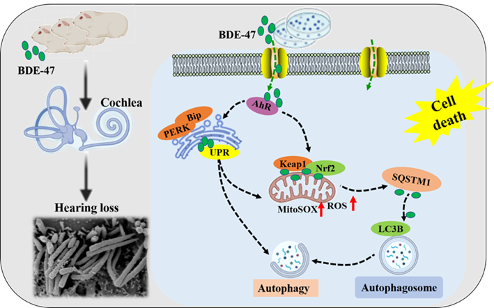 感音性听力损失受遗传和环境因素双重影响,发病机制复杂。环境化学污染物暴露可能成为重要诱因之一,为此,本研究构建体内动物模型并结合体外染毒试验探讨了早期发育期间溴代污染物BDE-47暴露与听力损伤风险关系以及潜在的分子机制。在体内实验中,幼年期豚鼠连续28天经口灌胃暴露于BDE-47,随后检测其听力阈值变化、耳蜗毛细胞形态、AhR以及自噬相关蛋白表达。体外实验中,使用听觉细胞系进一步验证了BDE-47对细胞活力、氧化应激、自噬流及内质网未折叠蛋白反应(UPR)的影响,并采用AhR抑制剂CH223191、线粒体分裂抑制剂Mdivi-1和内质网应激抑制剂TUDCA进行机制干预。本研究首次系统阐明了BDE-47通过AhR-线粒体/内质网应激-自噬抑制轴引起听力损伤的机制,强调了环境污染物在听觉发育早期可能带来的长期风险。该研究结果不仅为评估敏感人群早期接触暴露风险提供了理论依据,也为临床开发针对AhR或自噬过程的干预提供潜在的策略。