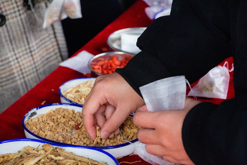 此次活动主要分为中药香囊制作、中药药材展示、免费药茶品尝三个部分。活动当天,天公并不作美。乌蒙蒙的天、淅淅沥沥的雨、刺骨的寒风并没有削减同学们参与活动的热情。活动现场,伴随着清幽的古风乐,志愿者们为前来参加活动的同学们讲解药材名称与主要功效,当归、白芷、党参等常见药材应有尽有。大家将各味药材装入精美的囊袋中,简单收口,一个个小巧讨人的小香囊便制作完成。茶壶外,空气中弥漫着淡淡的茶香和药香;茶壶上,白雾袅袅上升又慢慢散去;茶壶里,药材的颜色慢慢渗出,在无色透明的沸水中晕开;这一切都给人以美好宁静之感。
