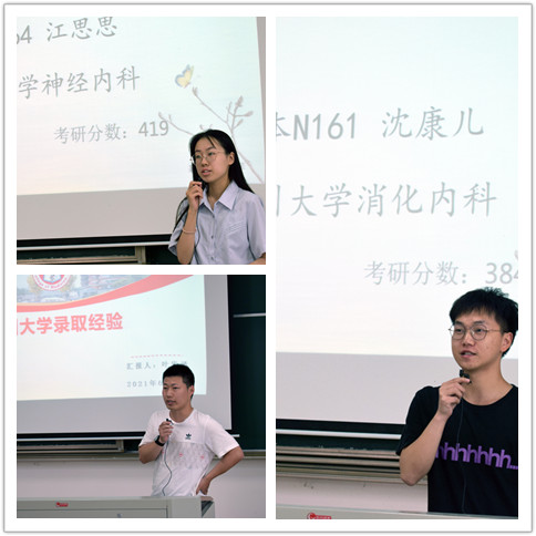 医本164班江思思、医本N161班沈康儿、医本162班叶华泽三位同学分别分享了自己的考研经验和心路历程。江思思同学考上了浙江大学神经内科专业,她分享了自己的备考流程,并从择校选择、考研心态等各方面给出了细致的建议;沈康儿同学被苏州大学录取,除了学习经验分享,经历调剂的他还从“努力”和“自信”两方面不断鼓励学弟学妹;叶华泽同学选择出国留学,目前收到了日本九州大学Offer,他畅谈了自己赴日留学的想法,向同学们分享了联系导师、准备材料等各方面的经验。