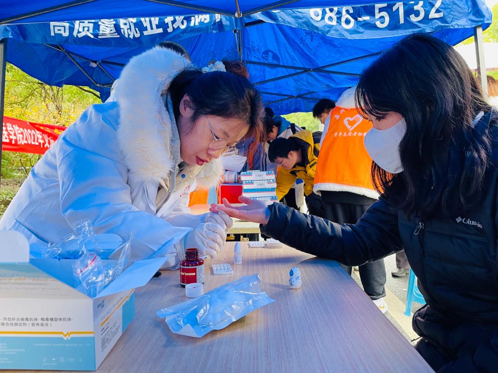 防艾宣传活动现场,来自嘉兴市疾控中心、嘉兴学院附属妇儿医院、嘉兴市城南卫生院的老师们同学们做防艾知识宣传,发放宣传单页和安全套开展指尖采血,进行乙肝、丙肝、梅毒、艾滋的快速检测。