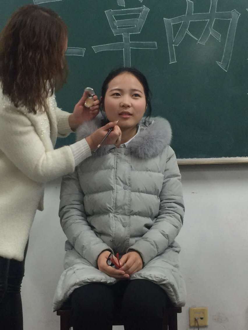 听闻消息的同学兴致勃勃地来到活动现场,个个伸长了脖子,认真听“三草两木”的老师讲解彩妆技巧。令我们惊喜的是,在众多女生中竟然坐着一个男生!看来爱美之心人皆有之。在活动中,同学自愿当模特让老师在她身上展现彩妆的魅力。在同学们翘首以盼和老师的精湛技艺下,“模特”原本略显平凡的脸变得容光焕发,显得格外精神,同学们不禁发出声声惊叹。