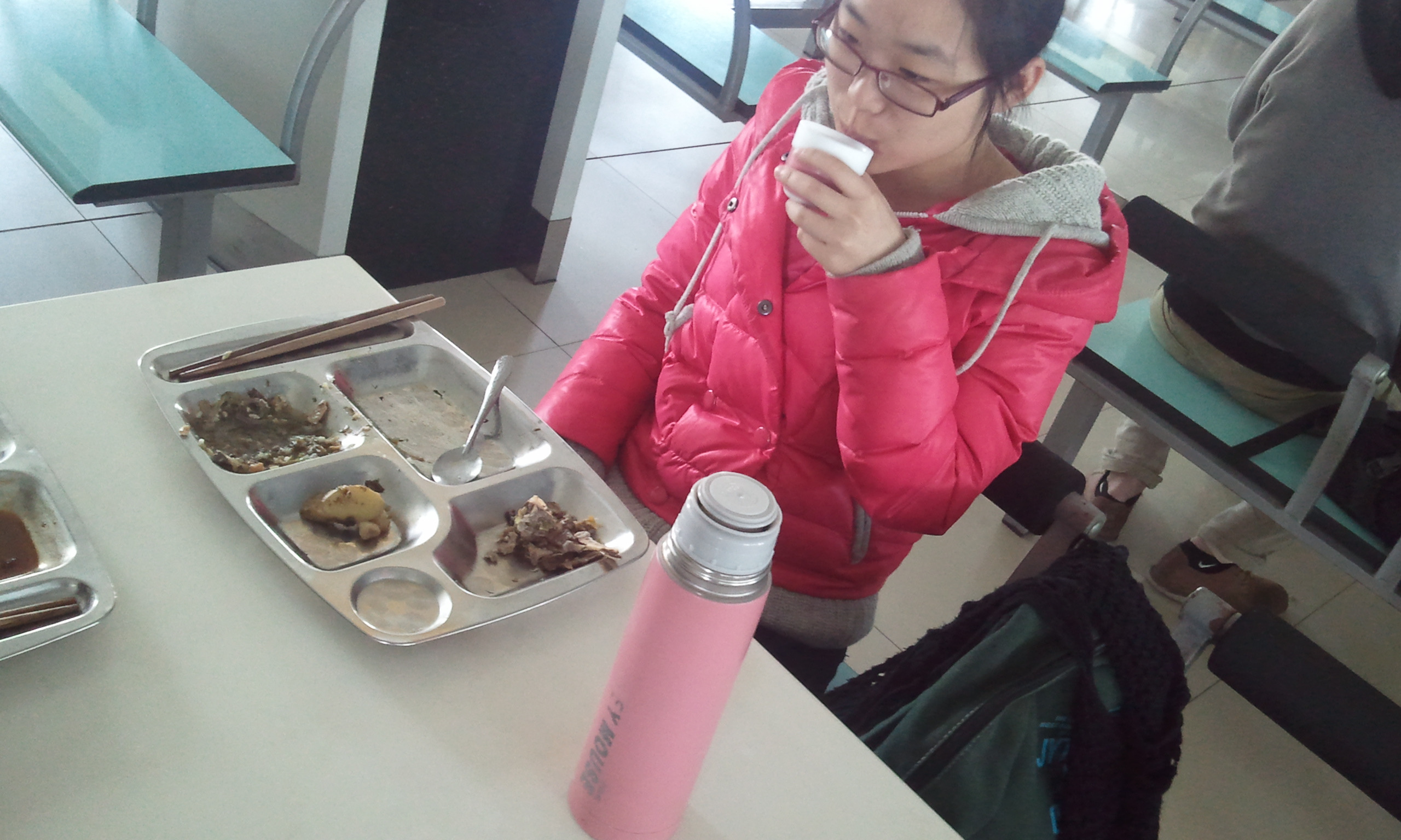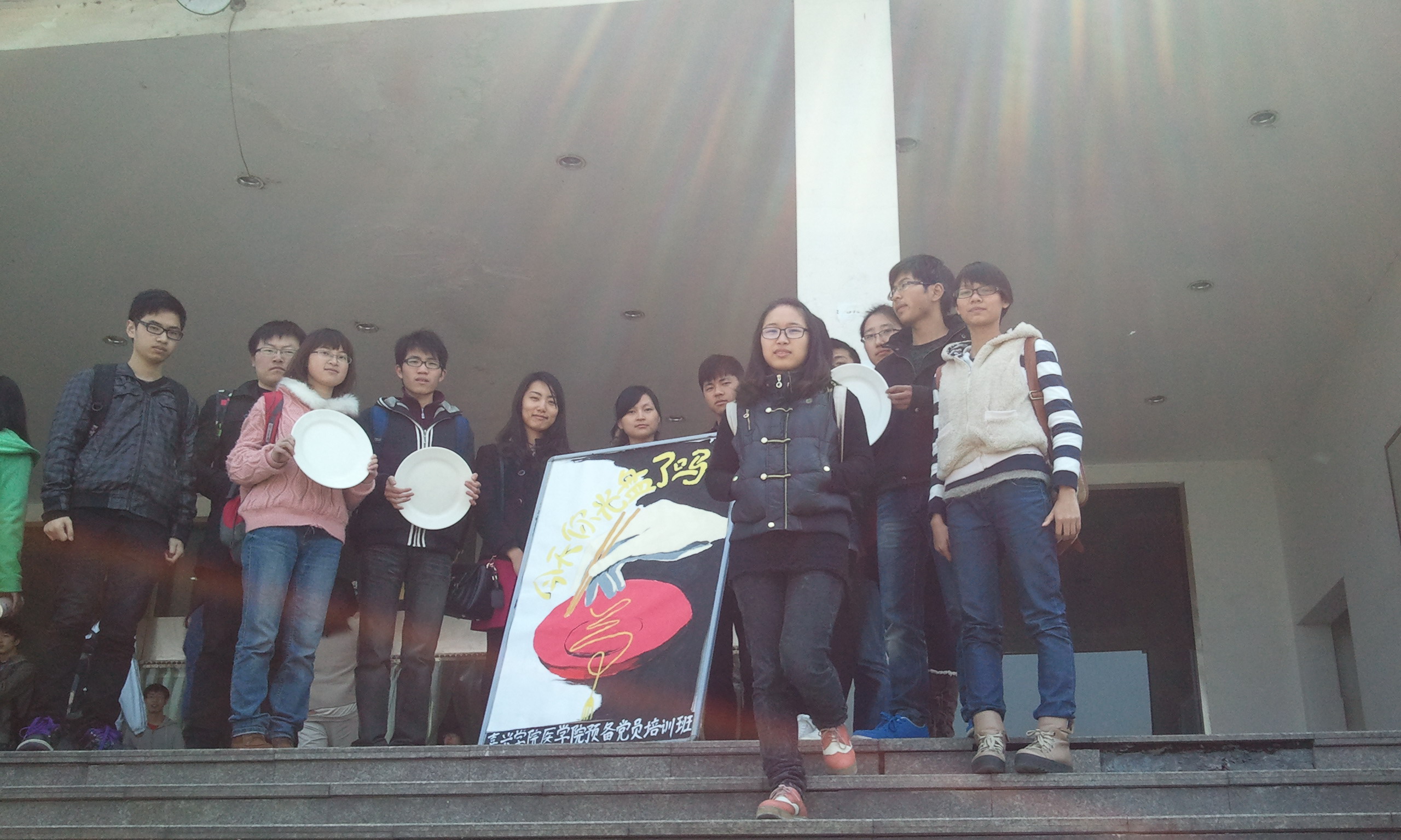 大家在中午吃饭高峰期把事先准备好的海报立在食堂门口,引来了就餐同学们的目光。大家分成两部分,一部分预备党员学员负责随机采访不同的同学,与他们交流“光盘”行动的意义,另一部分预备党员学员负责记录“光盘模范”。