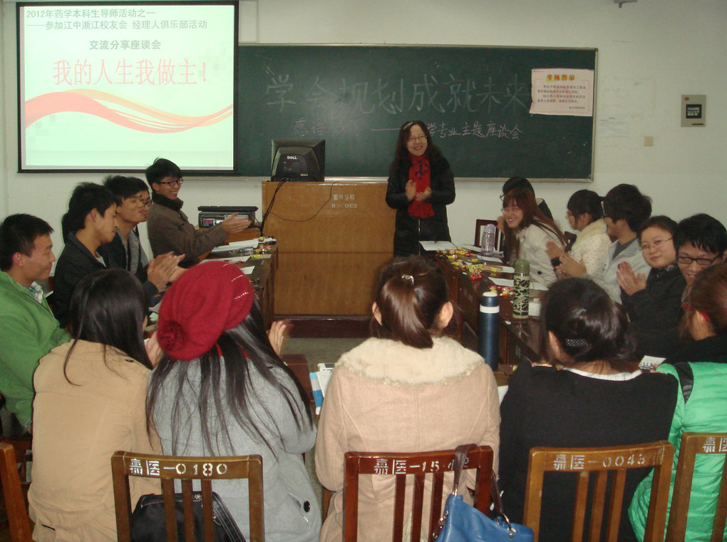 浙江校友会组织的经理人俱乐部活动。本次活动邀请了黄老师的两位校友,诺华制药有限公司大中国区销售培训部副总监涂益华先生,和惠氏制药有限公司全国医院销售经理吴能辉先生,来杭作题为“在新环境下的职业规划”和“职业发展体会与思考”的讲座。为了把优质的社会资源带给学生,也为更深入地开展药学本科生导师的指导工作,黄老师特地带领了一批以药学服务与药品流通模块的大三年级为主的药学同学,亲身聆听药品销售与流通领域的优秀精英以亲身经历介绍的职业规划之路。