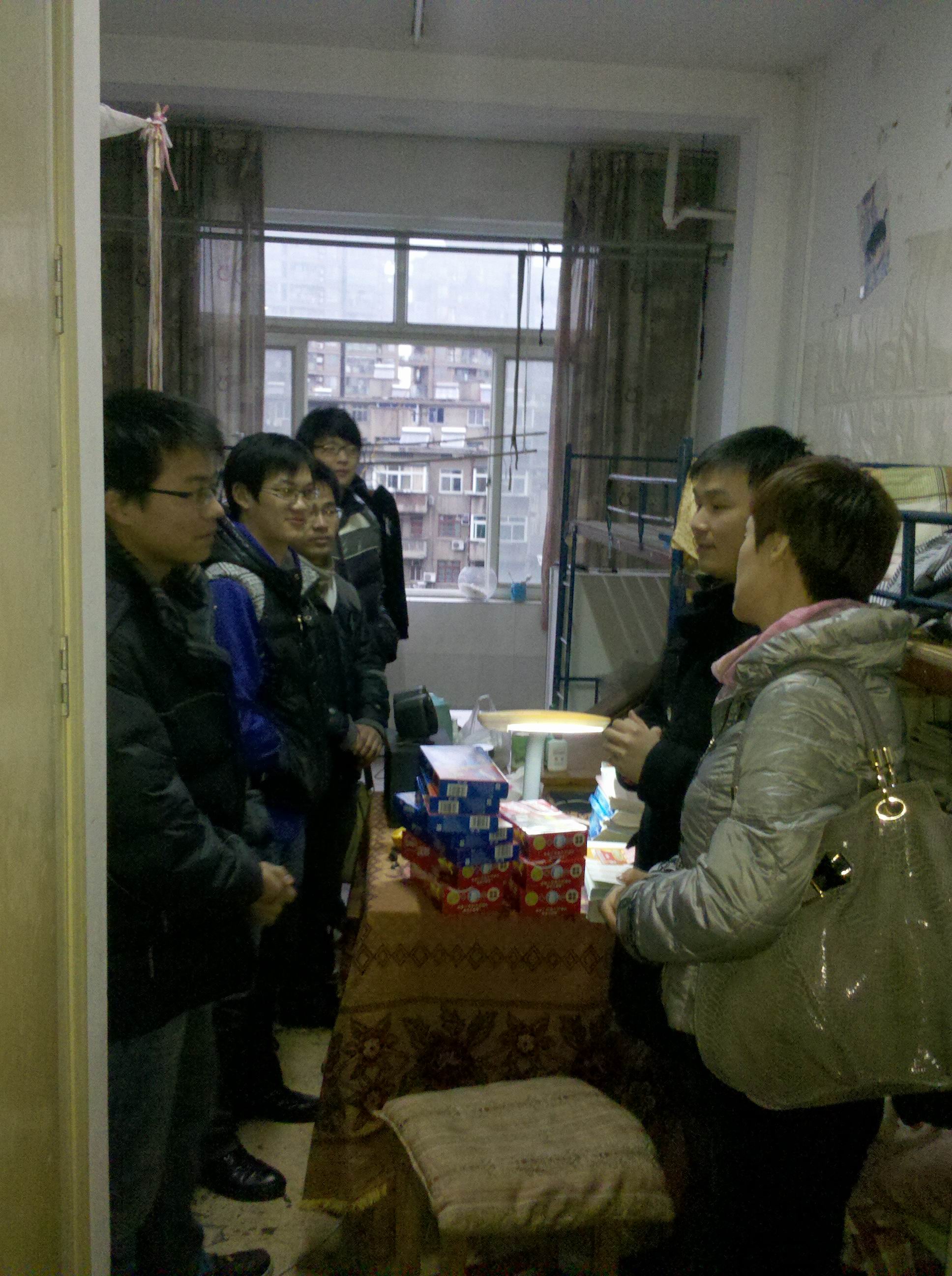 ACG港湾 2012届毕业生中共有149人报考了2012年的研究生入学考试,占毕业生总人数的36.6%,是历年来报考人数之最,目前考研备战已进入白热化阶段,为了在最后阶段给大家鼓劲,12月27日下午4点半,ACG港湾 张杰书记、谢宏副书记、学工办蒋小红主任、彭溶老师带着精心准备的慰问品来到老卫校宿舍看望考研学生。 张杰书记首先代表学院向考研学生表示亲切的慰问,叮嘱他们要保证营养、注意身体、积极备考,并预祝他们在2012年研究生入学考试中取得好成绩。谢宏副书记也希望同学们在冲刺最后阶段,把身心调整到最佳状态,取得考研的最终胜利。 同学们纷纷表示一定不辜负领导和老师的殷切希望,争取在2012年研究生入学考试中取得优异成绩!