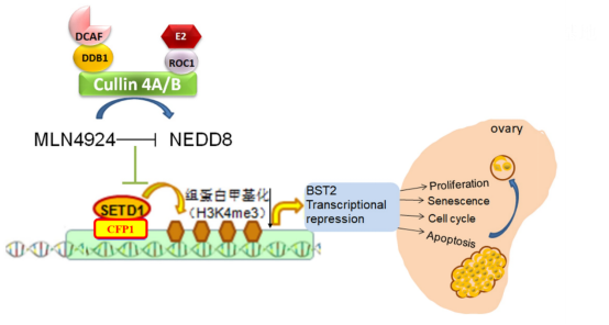 杨柳青和胡汉寅同学研究发现,体内抑制CRL4 泛素连接酶复合物的活性可以明显抑制卵巢肿瘤生长,并且寻找到了CRL4泛素连接酶新的底物蛋白CFP1。CFP1是组蛋白甲基转移酶SETD1复合物的关键亚基,通过识别非甲基化DNA,驱动SETD1复合物催化H3K4三甲基化。作者发现CFP1在人卵巢癌组织中高表达,并与卵巢癌恶性程度呈正相关,提示CFP1在卵巢癌增殖中发挥重要作用。通过构建CFP1敲除的卵巢癌细胞,发现CFP1敲除抑制卵巢癌细胞在体内外的增殖和迁移,导致细胞周期阻滞,促进细胞凋亡和衰老。通过western和免疫荧光发现,沉默CFP1后,H3K4me3减少以及组蛋白甲基转移酶SETD1复合物表达降低,这提示CFP1通过组蛋白甲基化影响了卵巢癌细胞的转录组。作者利用RNA-seq进行转录组分析寻找CFP1下游的靶分子,发现CFP1敲除和抑制CRL4泛素连接酶活性后均显著抑制了BST2的表达。在卵巢癌细胞中沉默BST2基因可抑制细胞增殖、凋亡和克隆形成。在CFP1敲除的细胞中过表达BST2基因在体内外挽救了由于CFP1缺失而导致的细胞增殖减慢。为进一步研究CFP1如何调控BST2转录,染色质免疫共沉淀实验发现 CFP1和与BST2基因启动子结合。综上所述,MLN4924抑制CRL4 E3泛素连接酶复合物通过影响CFP1蛋白表达抑制卵巢癌细胞增殖,而CFP1和SETD1均通过影响BST2转录调控卵巢癌细胞增殖、凋亡和克隆形成。该机制为确定卵巢癌临床治疗的分子靶点奠定了理论基础,进一步证明了CRL4 E3泛素连接酶复合物作为卵巢癌治疗靶点的重要性。