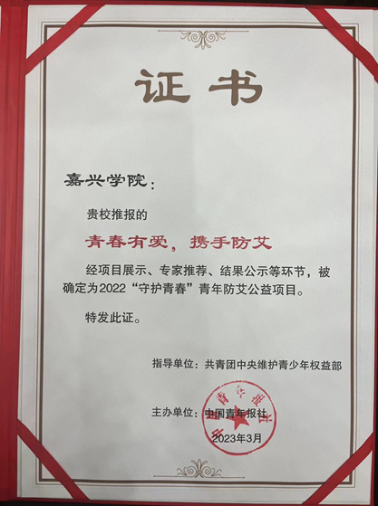 会上表彰了共青团中央2022“守护青春”防艾公益项目,嘉兴学院ACG港湾