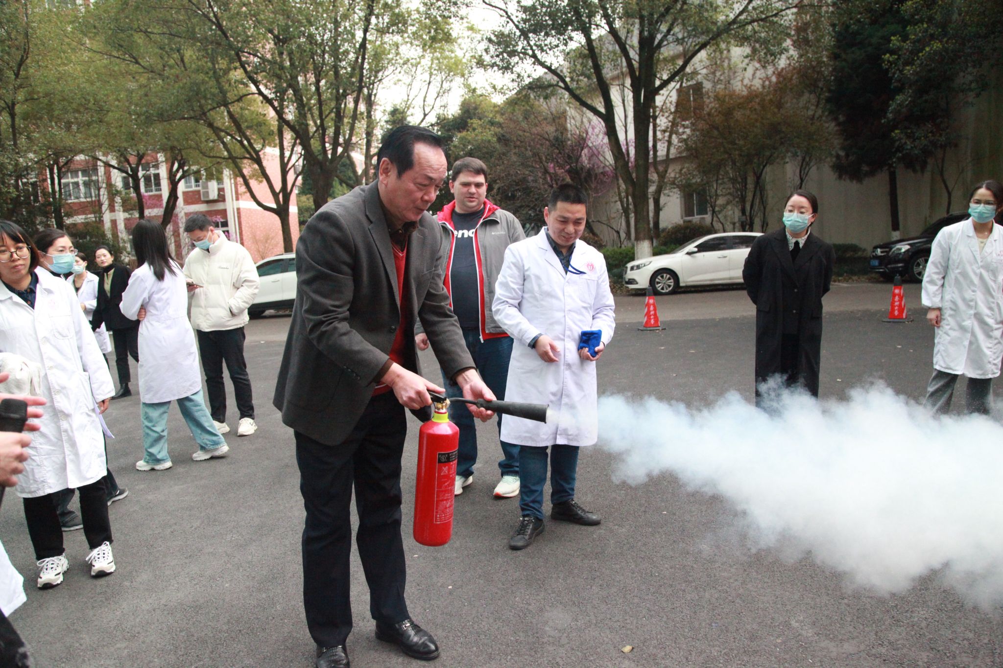 随后,全体师生在楼前小广场列队,学校保卫处的老师为师生讲解师范灭火器正确使用方法,在场师生纷纷进行实地操作。