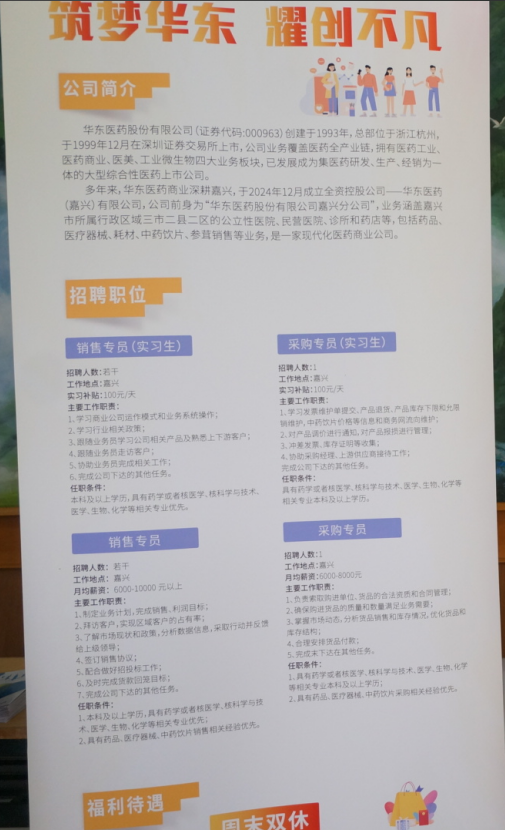 在TCL报告厅举办以“医心向学,‘职’等你来”为主题的2025届毕业生医药类专场招聘会。本次招聘会邀请到中国人民武装警察部队海警总队医院、嘉兴市王店人民医院、嘉兴市南湖区建设街道社区卫生服务中心三家医疗卫生单位,以及金赛药业、华东医药股份有限公司嘉兴分公司、麒盛科技股份有限公司等近20家医药类企业,共提供各类岗位百余个,学院2025届毕业生参与此次招聘会。
