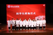 典礼中举行了庄严的授袍仪式。主席台嘉宾为新生代表授袍,为他们系好医学之路的“第一颗扣子”。这不仅是对未来的美好祝愿,更是医学精神与责任的郑重传递。
